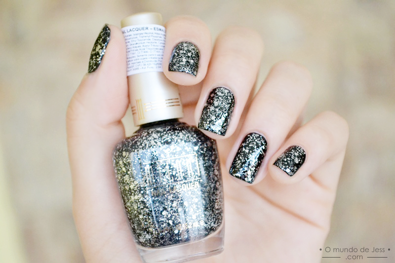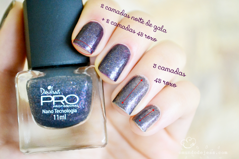 Lamed é uns esmalte de base roxa e glitters em cores que não consegui identificar muito bem. Parece quem tem roxo, vermelho, verde, azul… Uma mistureba que resultou em uma cor fantástica! Desde que recebi os esmaltes, estava super curiosa para ver o resultado dele nas unhas e amei. A esmaltação foi super fácil, usei duas camadas e ele secou bem rapidinho. A limpeza dos cantinhos foi meio chatinha porque ficou tudo manchado com glitter, mas nada água e sabonete não resolvam 😛