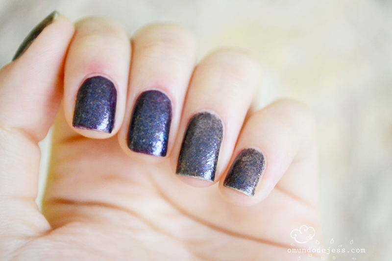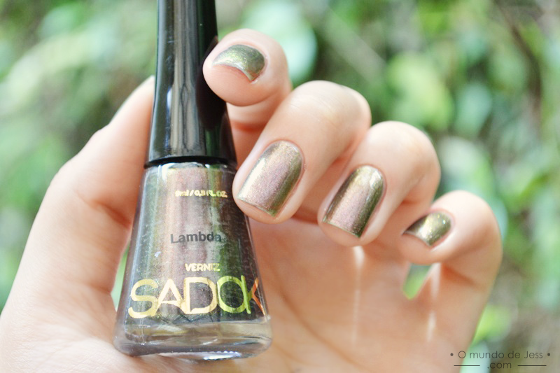 Lambda é um esmalte holográfico, com uns três tons diferentes: roxo, verde e marrom (pelo menos para mim, pareceu ser essas cores hehe). Achei ele bem estranho e não gostei muito do efeito. Dos cinco testados de hoje, ele foi o mais “gostoso” para esmaltar, estava com uma consistência mais rala que os outros. Passei duas camadas e cobriu muito bem. Secagem rápida e brilho lindo. Só uma coisinha que deixou ele todo feio:
