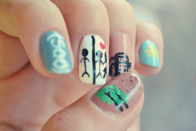 A princípio eu tinha feito uma nail art em toys do filme Alice no País das Maravilhas, mas sabe quando você acha que tem algo de errado com elas? Então resolvi mudar, e o escolhido foi (500) days Of Summer, apesar de não ter ficado como eu gostaria, eu até acabei gostando.