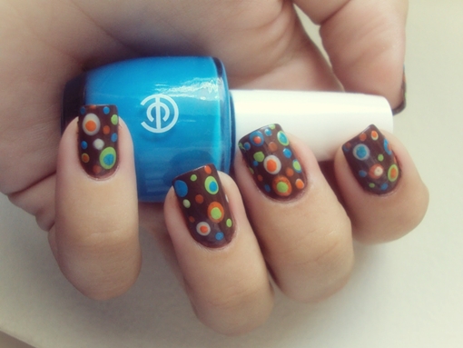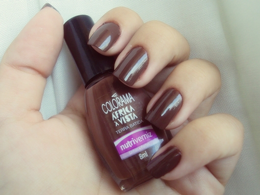 Resolvi fugir do tradicional e fazer umas bolinhas mais animadas…Primeiro esmaltei com o Terra Batida da Colorama, e posso falar? Amei ele sozinho! Nunca tinha usado esmalte marrom e agora superei essa aversão! Olha só como ficou sozinho: